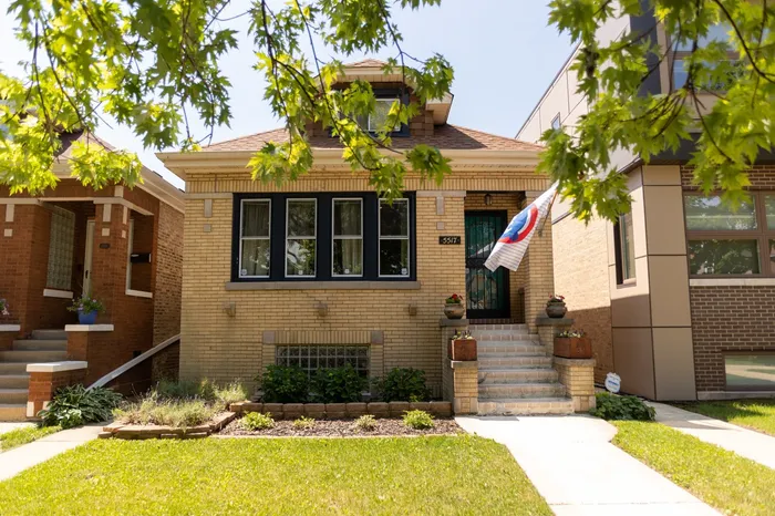 Portage Park! All brick bungalow located near Chopin Park. This great home offers a nice sized living room and separate dining room both with recessed lighting. Nice sized kitchen with a large walk in pantry and three season room off the kitchen leading out to the backyard. 2 bedrooms on the main level with hardwood floors. One bedroom on the 2nd level offering plenty of storage and closets in addition to a den/workspace. Full unfinished basement leading out to the fully fenced backyard that has an abundance of perennials and a nice pergola. Brand new central A/C unit installed in June 2022. Brand new hot water heater installed in April 2022. Large 2.5 car garage.